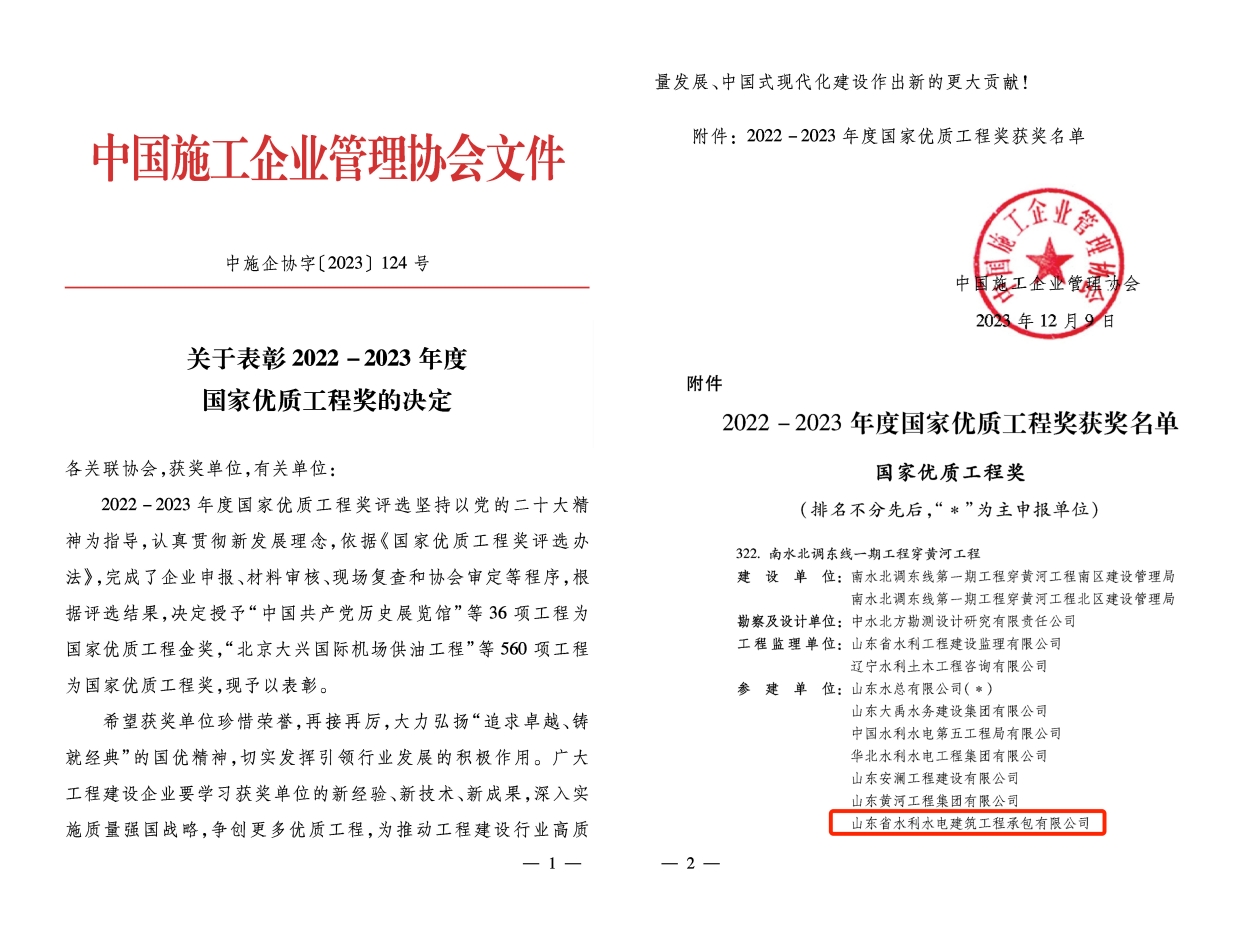 近日,中国施工企业管理协会公布了《关于表彰2022-2023年度国家优质工程奖的决定》,公司承建的南水北调东线一期工程穿黄河工程荣获“国家优质工程奖”,为公司品质工程名片上再添浓墨重彩的一笔。